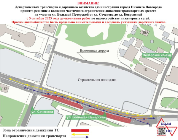.В Нижнем Новгороде с 5 октября до окончания работ по переустройству инженерных сетей будет временно ограничено движение транспорта на улице Большой Печерской от улицы Сеченова до улицы Ковровской. Движение сохранятся в обоих направлениях по одной полосе.