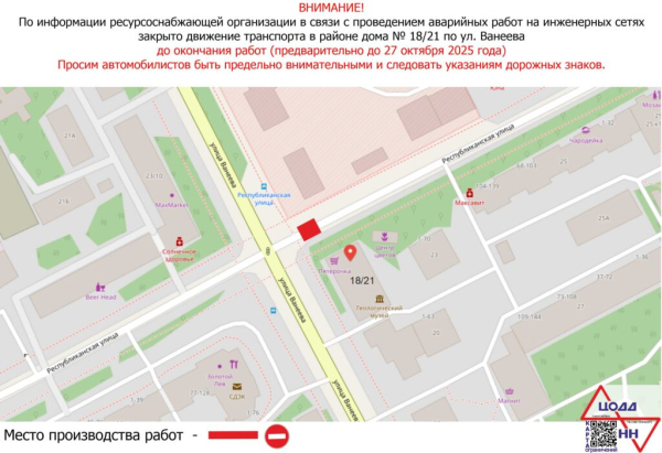 В Нижнем Новгороде закрыто движение транспорта по ул. Республиканская в районе дома № 18/21 по ул. Ванеева до окончания работ (предварительно до 27 октября) в связи с проведением аварийных работ на инженерных сетях.