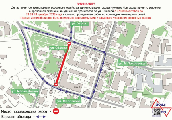 В Нижнем Новгороде с 07.00 6 октября до 23.59 28 декабря 2025 года в связи с проведением работ по прокладке инженерных сетей будет ограничен проезд транспорта по улице Обозной (на участке от ул. Малой Покровской до ул. Маслякова).