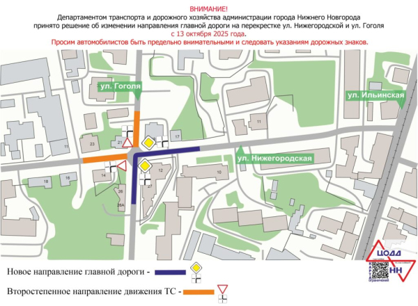 На перекрестке преимущество в движении будет у автомобилей, двигающихся по ул. Нижегородской со стороны ул. Ильинской и поворачивающих налево на ул. Гоголя в сторону ул. Малой Покровской, в обратном направлении — при повороте направо с ул.Гоголя на ул. Нижегородскую в направлении ул. Ильинской. Ранее главная дорога была у автомобилей, двигающихся по ул. Гоголя в прямом направлении.